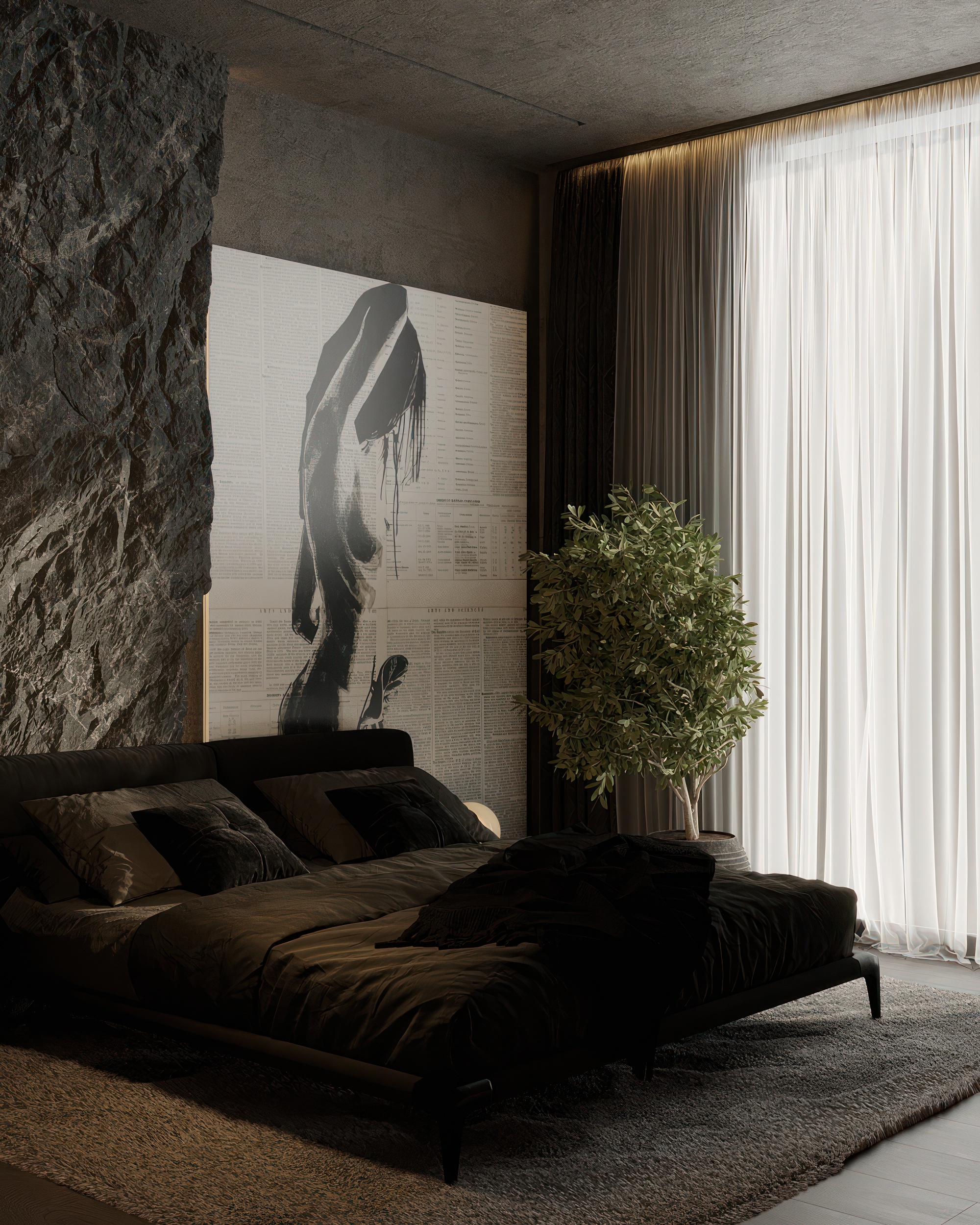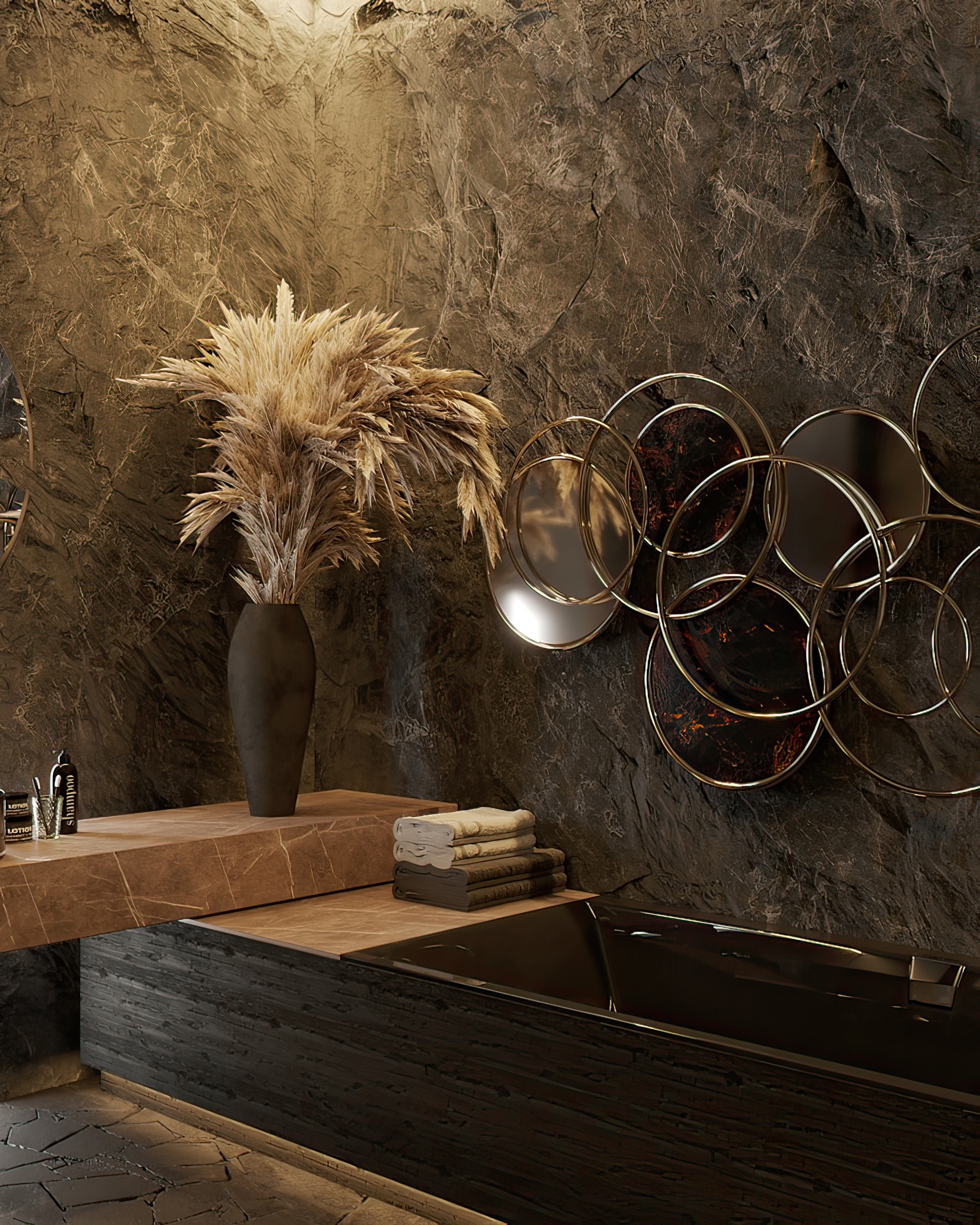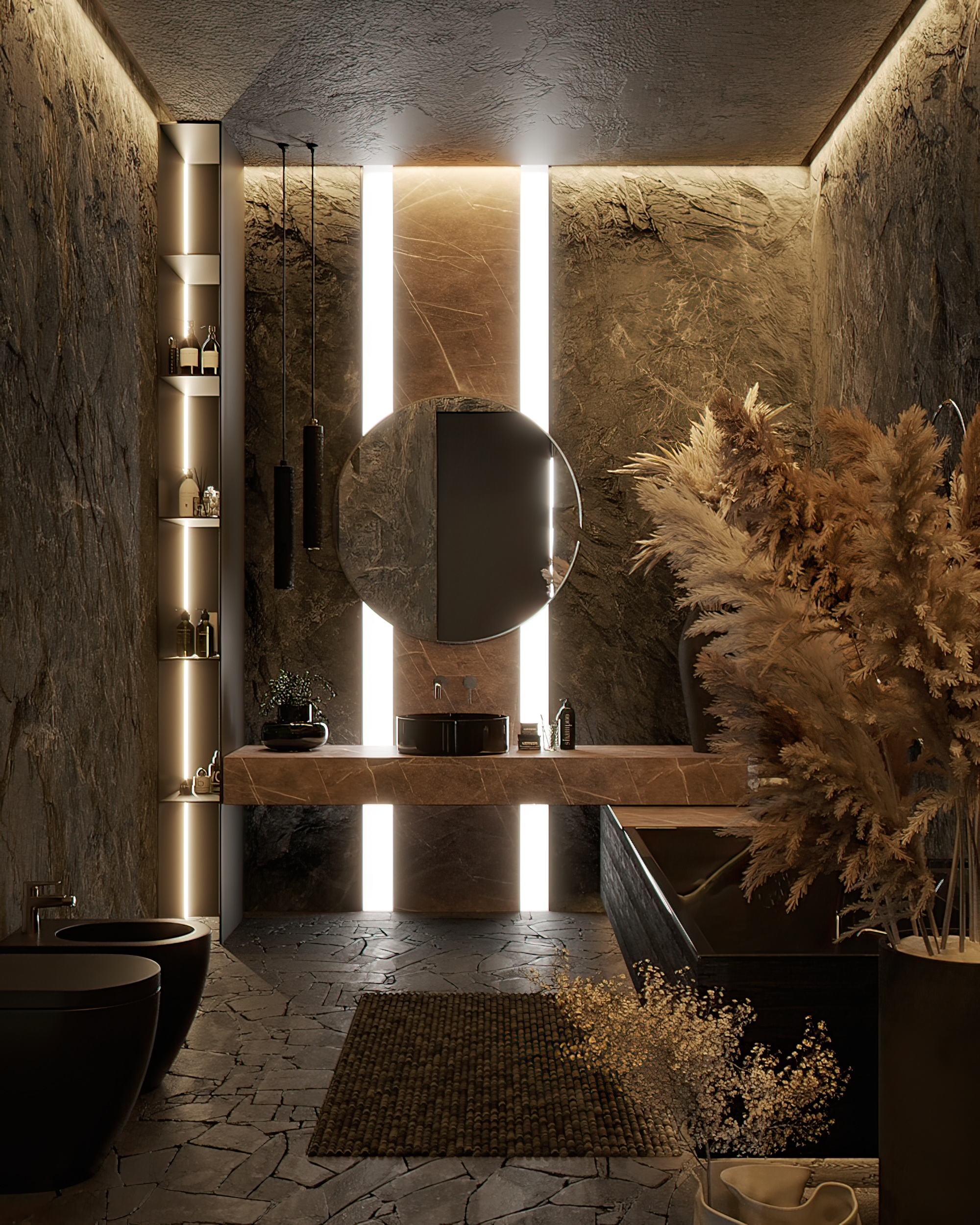 Stone is the main character of the interior. It can be traced in everything: in the texture of the walls, furniture, decorative elements [details are of great importance!] The cold shades of gray seem to send you to rocky coasts, giving the space a restrained elegance. We have created a place where you can feel the freedom and majesty of nature. A space that inspires and gives a sense of unity with the world around us.